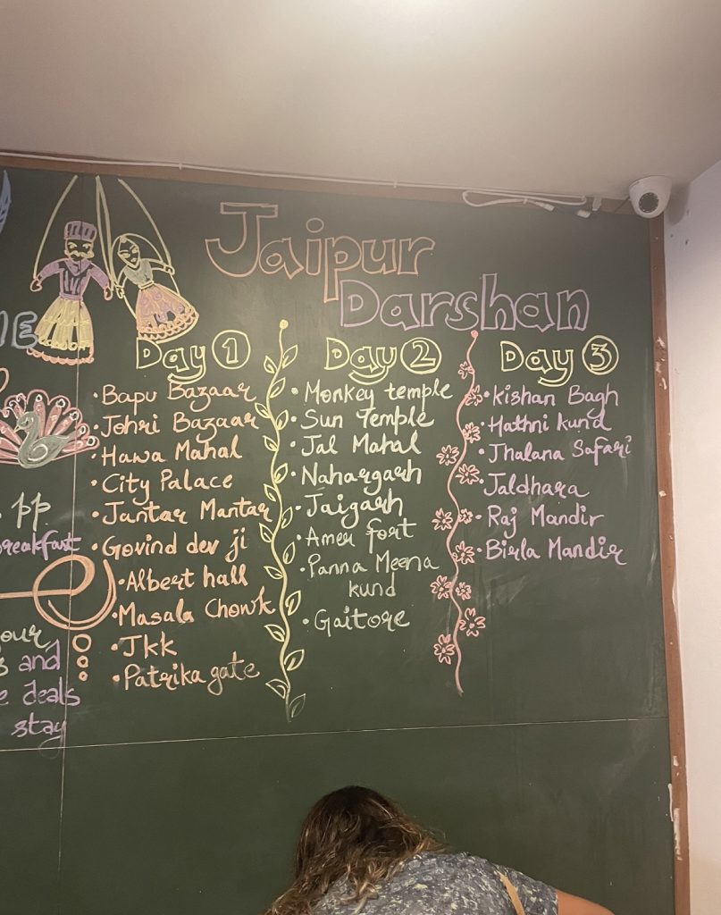 This hostel is set right in the centre of Jaipur and close to the train station, on the roof terrace there is a lovely seating area and pool with views of Nahargarh Fort. On entrance as shown above there are many ideas of an itinerary on the wall and staff are willing to help.